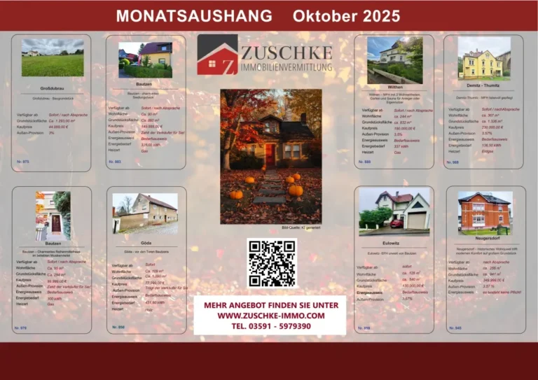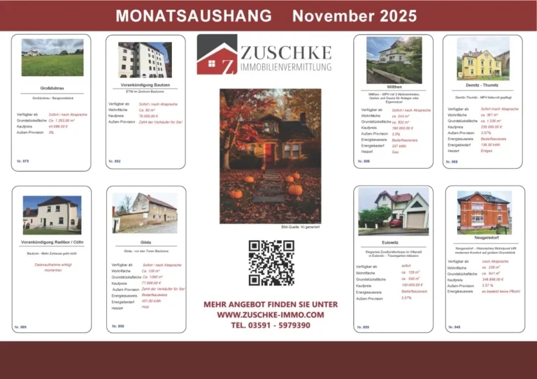 Monatsaushang November Hier ist der Monatsaushang für November. Gibt es etwas, das Ihr Interesse weckt? Wenn Sie Hilfe benötigen oder Fragen haben, kontaktieren Sie uns gerne:) Zuschke Immobilienvermittlung GmbHHauptmarkt 7 02625 Bautzen ​Telefon: 03591 59 79 390 info@zuschke-immo.com www.zuschke-immo.com