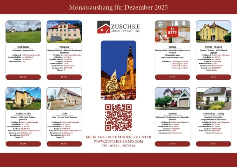 Monatsaushang Dezember Hier ist der Monatsaushang für Dezember. Gibt es etwas, das Ihr Interesse weckt? Wenn Sie Hilfe benötigen oder Fragen haben, kontaktieren Sie uns gerne:) Zuschke Immobilienvermittlung GmbHHauptmarkt 7 02625 Bautzen ​Telefon: 03591 59 79 390 info@zuschke-immo.com www.zuschke-immo.com