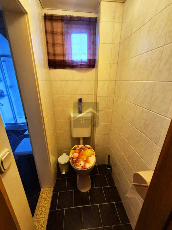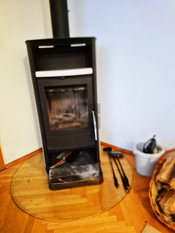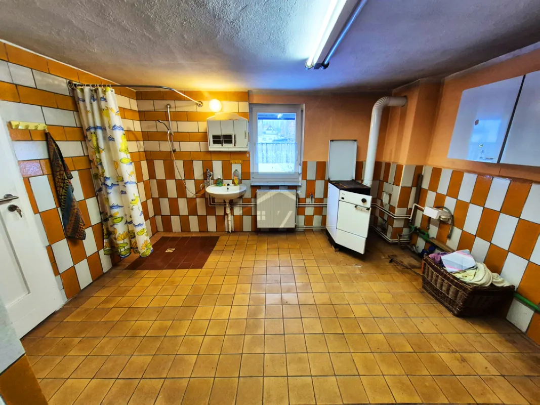Im hinteren Bereich des Erdgeschosses erwartet Sie das Waschhaus mit bodengleicher Dusche, Waschmaschinenanschluss sowie einem zusätzlichen Ofen, der an kühleren Tagen für wohlige Wärme sorgt. Ein separates WC ist ebenfalls vorhanden. Von hier aus erreichen Sie das Nebengelass, das bislang als Holz- und Geräteraum genutzt wurde und Ihnen weiteres Ausbaupotenzial bietet.