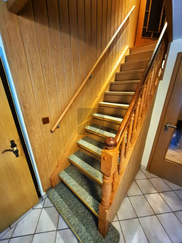 Über eine gepflegte Holztreppe gelangen Sie in Ihr Obergeschoss. Auf der linken Seite befindet sich das Badezimmer, das sich in einem zeitgemäßen Zustand präsentiert und mit Dusche, Badewanne, Waschtisch, Heizung sowie modernisiertem Dachflächenfenster ausgestattet ist.