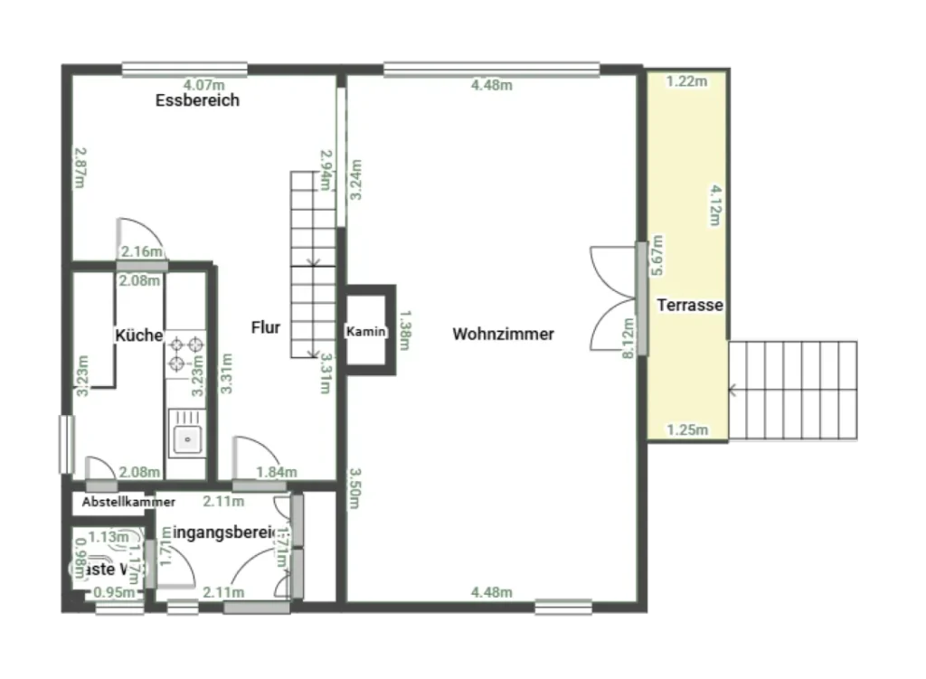 Ihr Wohnbereich selbst beeindruckt durch seine Offenheit und Helligkeit. Ein hochwertiger, fest eingebauter Kamin sorgt hier für wohlige Wärme und gemütliche Atmosphäre. Von hier aus gelangen Sie auf den Balkon, von dem eine massive Außentreppe Sie direkt hinunter auf die große Gartenterrasse mit Außenkamin führt – ideal für Familienfeiern und gesellige Sommerabende.