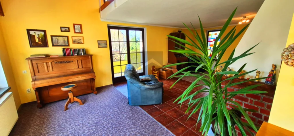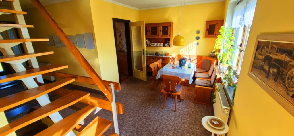 Eine besondere architektonische Note erhält der Wohnraum durch die offene Galerie im Obergeschoss, die derzeit als Arbeitsbereich genutzt wurde und Ihnen einen schönen Blick in den Wohnraum bietet.