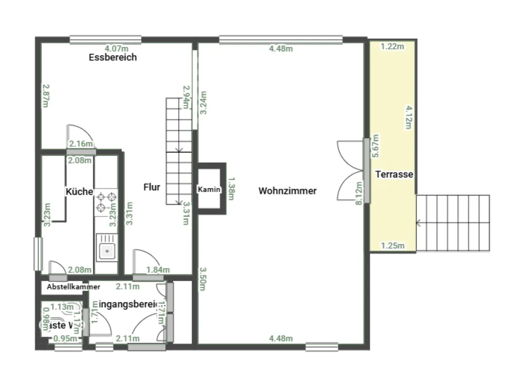 Beim Betreten Ihres zukünftigen Zuhauses gelangen Sie in den Eingangsbereich mit Gäste-WC (modernisiert 2002) sowie der zentralen Elektroverteilung. Von hier öffnet sich der Zugang in Ihren großzügigen Wohn- und Essbereich. Linkerhand befindet sich der Essplatz mit angrenzender Küche, welche zusätzlich über eine praktische Abstellkammer verfügt. Bei Bedarf ließe sich dieser Bereich auch offen zum Wohnbereich übergehend gestalten.