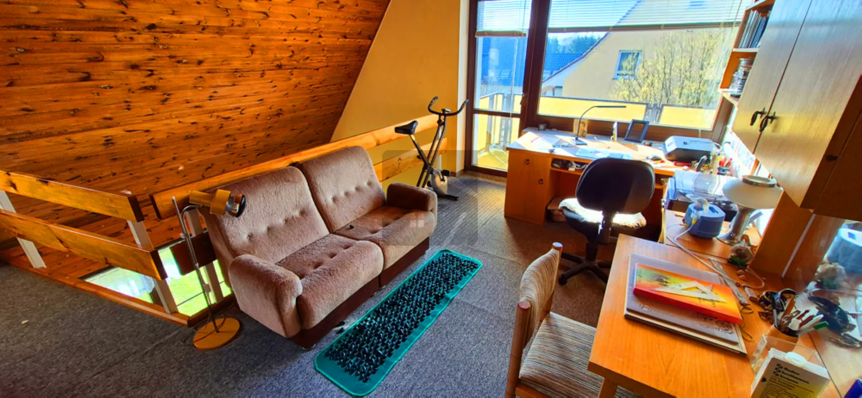 Eine besondere architektonische Note erhält der Wohnraum durch die offene Galerie im Obergeschoss, die derzeit als Arbeitsbereich genutzt wurde und Ihnen einen schönen Blick in den Wohnraum bietet.
