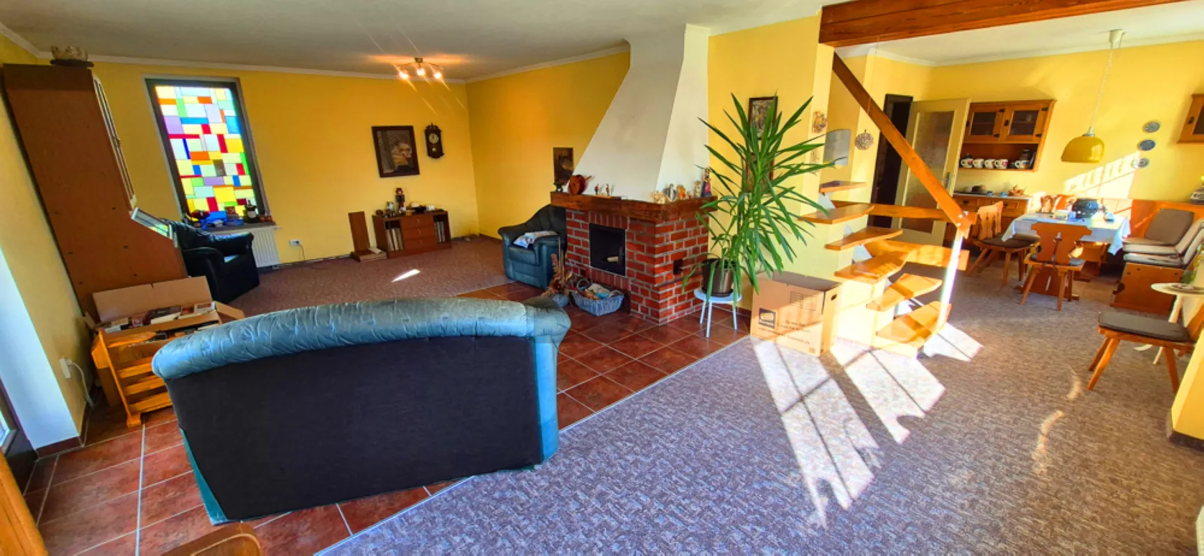 Ihr Wohnbereich selbst beeindruckt durch seine Offenheit und Helligkeit. Ein hochwertiger, fest eingebauter Kamin sorgt hier für wohlige Wärme und gemütliche Atmosphäre. Von hier aus gelangen Sie auf den Balkon, von dem eine massive Außentreppe Sie direkt hinunter auf die große Gartenterrasse mit Außenkamin führt – ideal für Familienfeiern und gesellige Sommerabende.