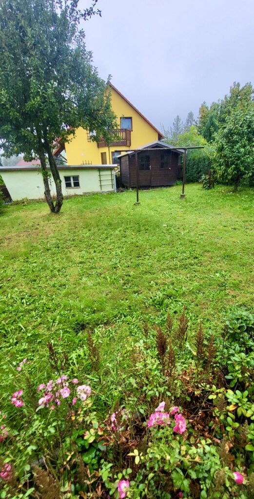 Von diesem Flur aus führt die Seitentür Sie in den unteren Bereich des Hauses bzw. zum Seitenausgang, der zum bereits erwähnten Nebengebäude führt, das an die Garage angrenzt und sich rechts vor dem Haus befindet. Hier haben Sie direkten Zugang zur Garage vor dem Haus sowie einen Ausgang zum großzügigen Grundstück hinter dem Haus, wo Sie eine Laube aus dem Jahr 2017 erwartet, die sich noch in sehr gutem Zustand befindet. Außerdem erreichen Sie von hier auch die bereits erwähnte Garage, die von außen zugänglich ist.